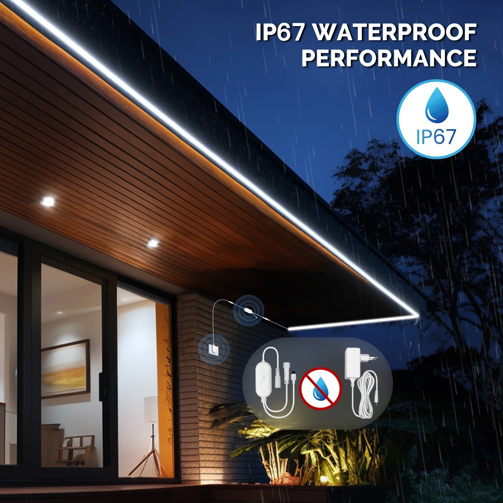 الشريط الضوئي نفسه فقط هو المقاوم للماء، أما وحدة التحكم ومحول الطاقة والأجزاء الخارجية الأخرى فليست مقاومة للماء. يُرجى تجنب ملامسة هذه المكونات للماء.