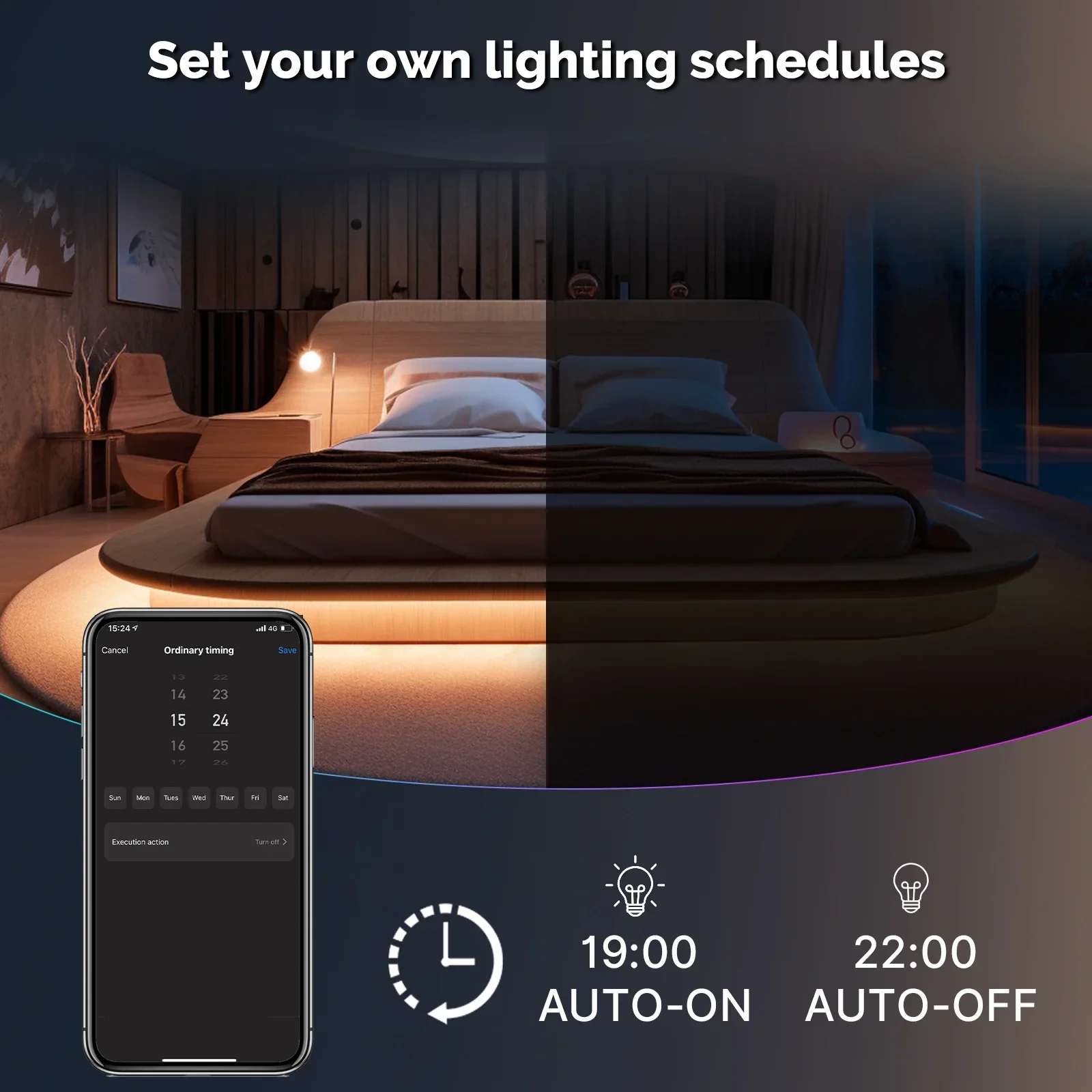 يمكن ضبط الشريط ليعمل أو يتوقف تلقائيًا وفق جدول زمني محدد مسبقًا، مما يساهم في توفير الكهرباء وتسهيل الاستخدام.