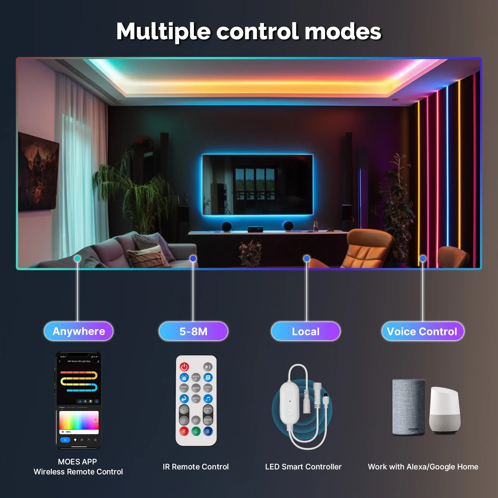 يمكنك تنشيط وإطفاء الشريط وتغيير اللون وضبط السطوع عبر المساعدات الصوتية مثل أليكسا/جوجل هوم، مما يتيح تحكمًا بدون استخدام اليدين ويجعل حياتك أسهل.